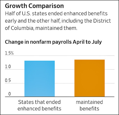 Nonfarm payrolls rose 1.33% in July from April in the 25 states that ended the benefits and 1.37% in the other 25 states and the District of Columbia, the Journal analysis of Labor Department data showed. The payroll figures are taken from a government survey of employers. The analysis compared July totals with April, before governors in May started announcing plans to end or reduce the benefits during the summer.