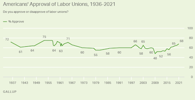 Sixty-eight percent of Americans approve of labor unions. Though statistically similar to last year’s 65%, the current reading is the highest Gallup has measured since 71% in 1965.
