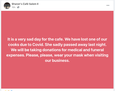 Freedom isn’t free. I note that while the announcement from the cafe did plead for wearing masks, there was no mention of getting vaccinated, which is the single most effective way to fight this scourge. Secondly, visiting the business to give a donation in person…indoors there, would not be the best move either.