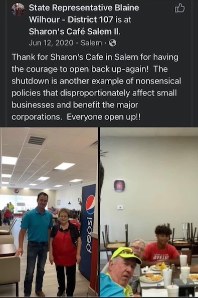 On June 12, 2020 Representative Blaine Wilhour visited various restaurants in Marion County and told them the health department had no authority to tell them they could not have indoor dining. Melissa contacted Bill Milner, our State’s Attorney, to advise. Mr. Milner stated no judge would side with the health department when a small business is trying to stay open to make a living. Also that inside dining is no more harmful to the public than Wal-Mart that is full of shoppers.
