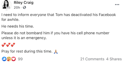 Facebook did not take down his page. Tom took down his page. People were constantly harassing him and haranguing him. After a while it gets to a person. He just needs to take some time. So he has put it on the do not disturb status for a while. So all those people that are blowing me up, there’s your answer, so please don’t blow me up either. He is still out there fighting the cause he just needs a break from Facebook because he was getting thousands upon thousands of messages a day, and he needed a breather. So he wasn’t Zuckerberged there’s no conspiracy theory here. Tom decided to take down his own page for sanity’s sake, so please give him a break. He has been fighting this fight non-stop for 18 months now, and it’s only gotten worse, that people were harassing, I wouldn’t say harassing, just constantly reaching out to him non stop. The messages every day, the text messages, the Facebook messages, the calling the office the staff in the office are just overwhelmed with phone calls. He’s going to keep up the good fight, and we’ll still, you know, have updates from him.