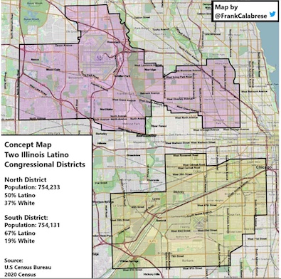 One thing to keep in mind is that whites, even in Chicago, pull a GOP ballot (or don’t vote in primaries) more than Latinos and definitely more than African Americans. So a district with potential voters of near 50% of minority voters in a primary can be won by a minority. And whatever Dem wins the primary will win the general. Of course this is all based on whether there are sham candidates put up to split the vote.