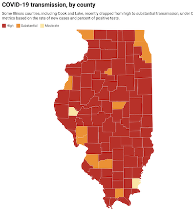 At the time the mandate was issued, Pritzker pointed to the recommendation from the federal Centers for Disease Control and Prevention that people wear masks indoors in areas of “substantial” or “high” coronavirus transmission. As of Monday, that still included all but two of the state’s 102 counties, both of them downstate.