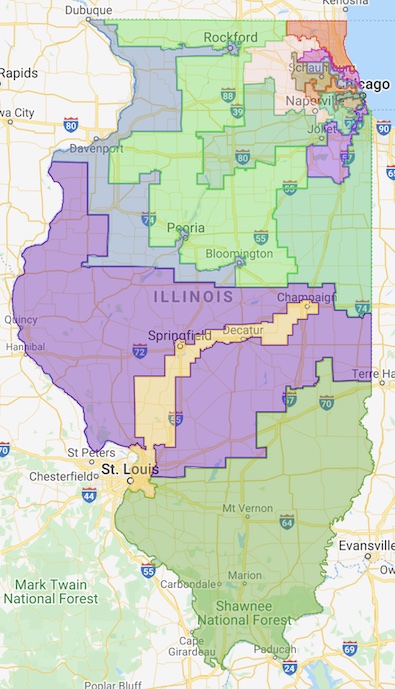 * Rodney Davis’ district is the 15th, the purple one above which runs from western Illinois, over to eastern Illinois and then back down to near the Metro East.