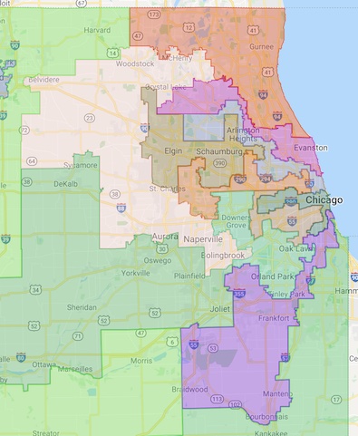 * Lauren Underwood’s 14th District runs from Joliet out to LaSalle County and up to DeKalb.