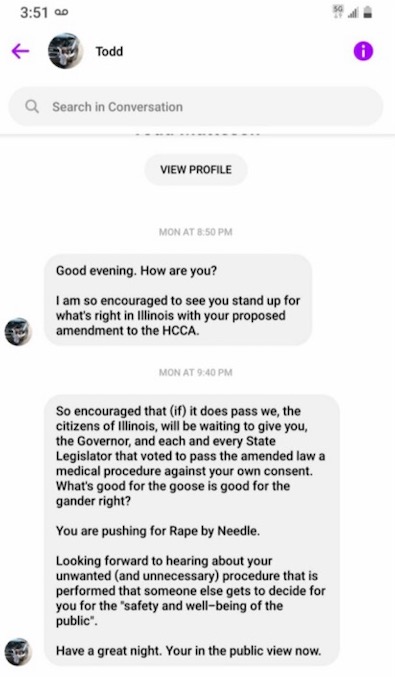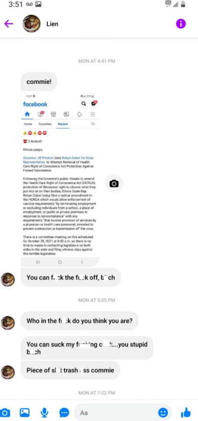Some of the critics who opposed vaccine mandates also sent menacing threats to her office. In a Facebook message Gabel’s office sent to law enforcement, one man from the Rockford area referred to her bill as “rape by needle,” and threatened to force a medical procedure on Gabel against her consent. Others leveled vile, sexist insults, or referred to her as “Satan,” or a “witch.”