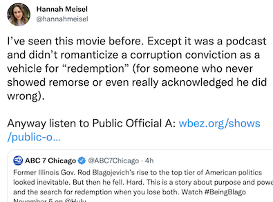 To find redemption one must actually believe in the need to redeem oneself and admit wrong doing. Blogo has not done that. And, neither has Mrs. Blago, who was prominently featured in the phone recordings, for that matter.