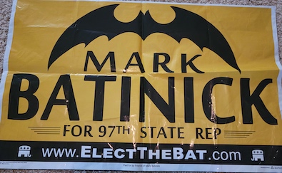 The sign, the “bat” sign, is something. There’s even a hint of innocence to it, in the best way, to merely running for office, but with a gimmick. It’s one of the cooler yard signs you’d ever see in the wild.