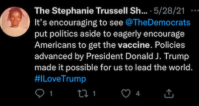 Indeed she did. There’s also this from just a few months ago in praise of Democrats pushing the vaccine…