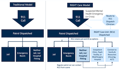 Since 2018, the city has employed a multidisciplinary model known locally as Rapid Integrated Group Healthcare Team (RIGHT) Care, which brings together teams of mental health professionals, paramedics, and specialized law enforcement officers who can better direct people in distress to community-based care and services. According to the Meadows Institute report, these teams responded to 6,679 calls from Jan. 29, 2018, to June 7, 2020. The analysis found that: