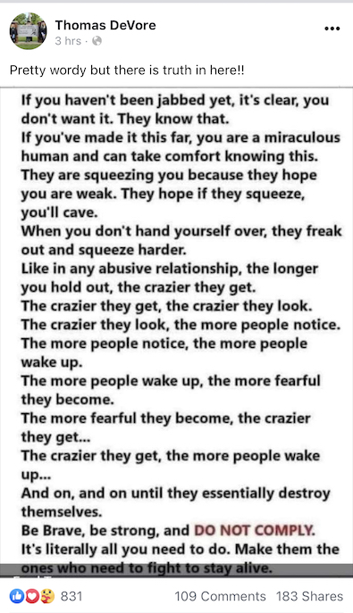 3)Devore wants an dystopian version of America. Autocratic and only for some people. You can interpret that for yourselves.