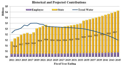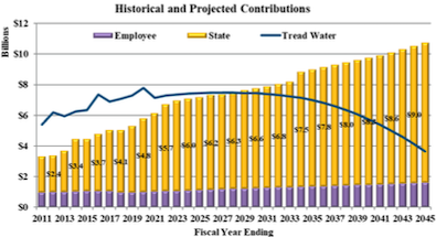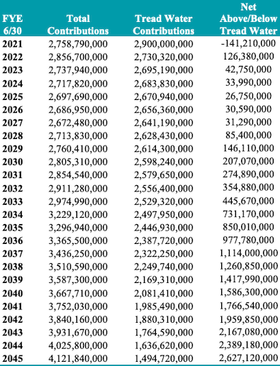 Contributions that are less than the tread water contribution causes the UAL to increase. The tread water contribution consists of two components: the normal cost, which is the cost of benefits earned in a given year, and the interest on the unfunded actuarial liability. This sum is referred to as the tread water contribution because it is the contribution necessary so that the UAL will remain constant, or “tread water” (absent experience gains or losses). The difference between actual contributions and the tread water contributions have increased the UAL by $4.71 billion [between June 30, 2011 to June 30, 2021].