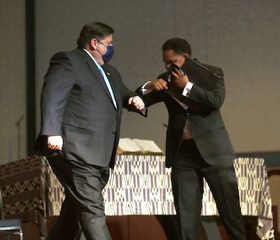 * “Gov. J.B. Pritzker, left, joins Aurora Mayor Richard Irvin at an event to encourage COVID-19 vaccinations at Cathedral of Grace St. John African Methodist Episcopal Church in Aurora in March 2021″…
