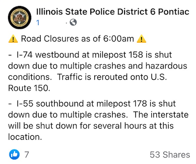 “Due to hazardous road conditions, some Driver Services facilities have been closed and others have suspended road tests. The following facilities are closed for the day: Beardstown, Bradley, Canton, Carthage, Gibson City, Greenville, Havana, Hillsboro, Monmouth, Pontiac, Rantoul, Roanoke, Streator, Taylorville, Tilton, Vandalia