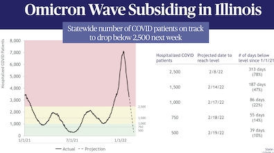 Illinois is currently at 2,496 hospitalizations, that’s 10 percent more than were in the hospital when the mandate went back into effect in August. During the past three weeks, hospitalizations have fallen 60 percent. It is not a stretch to believe that Illinois will be below, even well below, 2,266 hospitalizations by February 28th. Heck, they could even be below the mythical 1,700 at this rate.