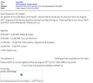 On August 2, 2019, Chris and Mary Miller invited Gov. Pritzker to visit and tour their farm. Here’s a screenshot of an email from Chris Miller to the Governor’s Office.