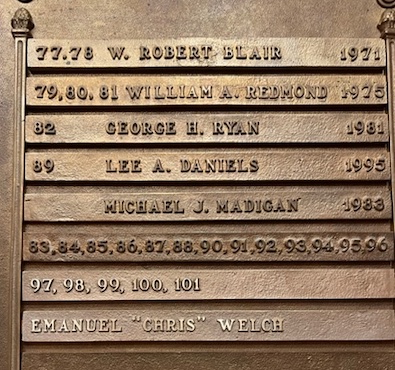 Secondly, I asked Rep. Chesney what there is to remove. He sent me a photo of this plaque of the list of all Illinois House Speakers…
