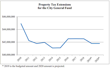 The graph below presents the trend of the city’s property tax extensions for General Fund purposes since 2010 (2009 property tax levy).