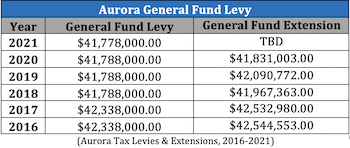 Since 2016, Aurora’s General Fund Levy Has Fallen From $42,338,000 To $41,778,000. (Aurora Tax Levies & Extensions, 2016-2021)