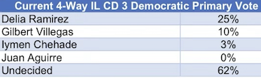 66% said they were undecided; 19% said they were for [state Rep. Delia] Ramirez; 11% for [Ald. Gil] Villegas and 1% for Chehade.