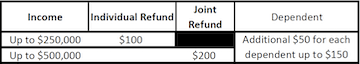 o People should review their 2021 income tax return. If they made $250,000 or less individually, they will receive $100. If they made $500,000 or less jointly, they would receive $200.