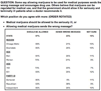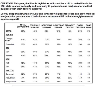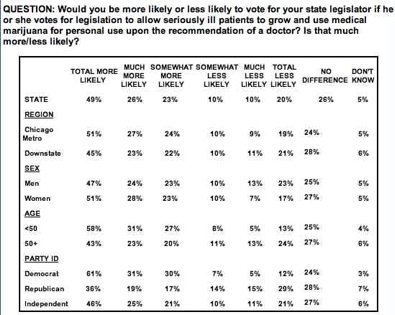 * The Marijuana Policy Project has released statewide and regional polling about medical marijuana. Full Illinois results can be found here. Below are some of the charts. The statewide poll was of “625 registered voters interviewed February 9-16, 2008 by Mason-Dixon Polling & Research, Inc. of Washington, D.C. Margin for error is plus or minus 4%.”
