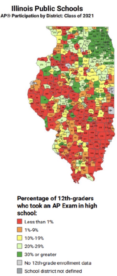 largest 10-year increase in the percentage of public high school graduates scoring a 3 or higher on an Advanced Placement (AP) Exam during high school.While 26.9% of the Class of 2021 scored a 3 or higher on an AP Exam during high school — giving them college credit at any public college or university in Illinois — not all students in the state have access to AP opportunities. Two-thirds of school districts in Illinois did not enroll any students in AP courses last year.