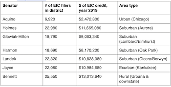 Senator Omar Aquino is the lead sponsor of the EIC expansion legislation. While EIC provides a significant benefit to Senator Aquino’s constituents, many low wage workers in poverty are living in the suburbs, and for that reason a number of suburban Senate districts actually receive far more benefit from the EIC than Senator’s Aquino’s. For example: two of the Senate districts with the highest amounts of EIC benefits received are suburban (Holmes & Glowiak-Hilton). See the chart below or full spreadsheet.