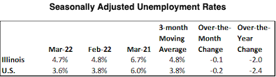 The state’s unemployment rate was +1.1 percentage points higher than the national unemployment rate reported for March, which was 3.6 percent, down -0.2 percentage point from the previous month. The Illinois unemployment rate was down -2.0 percentage points from a year ago when it was at 6.7 percent.
