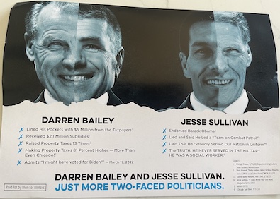 Is there anything that Richard Irvin doesn’t lie about? He lies about his own record by saying things that are in direct contradiction to what he has done in the past. And these mailers and ads against Baily and Sullivan are just beyond ridiculous. How anyone could have an ounce of respect for Richard Irvin is beyond me.