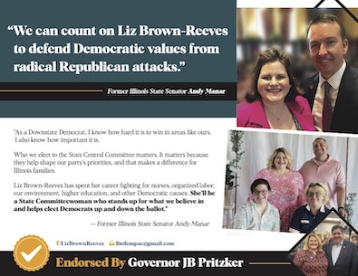 Pritzker has given $20,000 to Liz Brown-Reeves, a former Madigan aide turned lobbyist, for her race to join the Democratic Central Committee in a contest against Katherine Daniels, the sitting chair of the Adams County Democrats. Daniels is endorsed by the Sangamon County Democratic Party, which is headed by longtime Durbin ally Bill Houlihan.