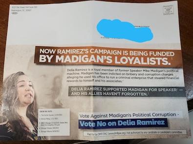 If you can’t see it, the mailer was paid for by DMFI PAC, a pro-Israel group that’s also backing Nikki Budzinski, Sean Casten and Raja Krishnamoorthi.
