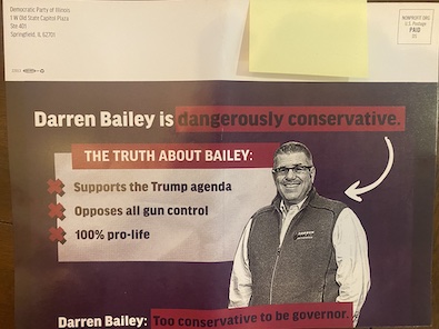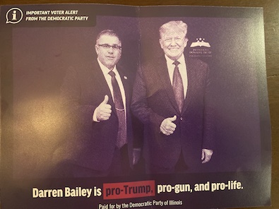 * You’ll recall that Gov. Pritzker gave the Democratic Party of Illinois $500,000 not long ago. I told subscribers on Monday about the first mailer (here and here). And this is their second mailer to Republicans…
