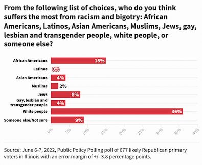 To the 36% poll number of whites as most oppressed - with all due respect, if anyone is surprised by this number they are not paying attention. What do people think the CRT in schools panic was about? Tucker Carlson’s Masterrace Theatre is the most influential program in Republican politics today so this should not be a surprising poll result.