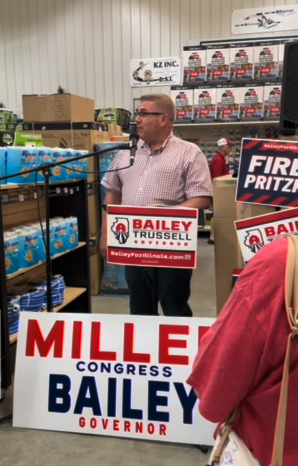 “Bailey shows one of many campaign signs soon to be donated to local recycling bins throughout Illinois”