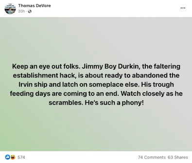 DeVore’s histrionics are beyond tiresome. Can’t wait for the end of the primary round.