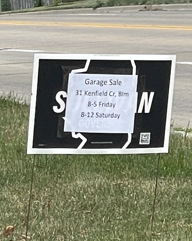 That sign gives me an idea. Howabout instead of removing candidates sign on public right a way they be required to paint over them (white paint, red whatever) then the community could use it as a community sign pole. Having a rummage sale? Found a cat? Lost a dog? Use that sign to post your own. Once your rummage is done or the cat has been claimed or your dog found, you remove your sign and leave it for the next community member.