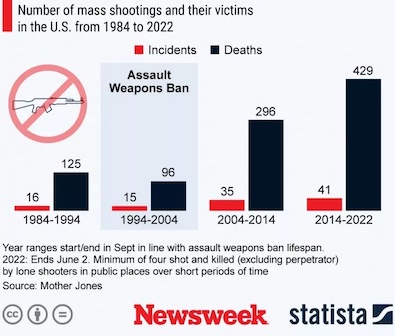 The data shows an almost immediate – and steep – rise in mass shooting deaths in the years after the assault weapons ban expired in 2004.