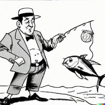 1920s pinstriped suit mafia gangster landing a butter tuna.