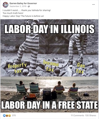 2019: Bailey Shared A Meme With Prisoners In Shackles With Caption “Labor Day In Illinois … Property Tax … Income Tax … Gas Tax” Compared To “Labor Day In A Free State” With Folks On The Beach. “I couldn’t resist….. thank you Valinda for sharing! Too much truth here! Happy Labor Day! The future is before us!” [Facebook, Darren Bailey for Governor, 9/2/19]