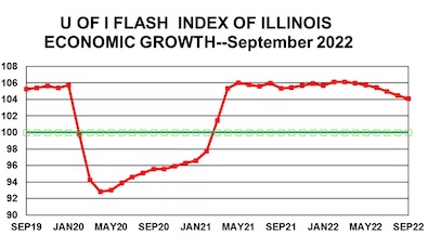 The University of Illinois Flash Index for September continued its gradual decline, falling to 104.1 from its previous reading of 104.5 in August.
