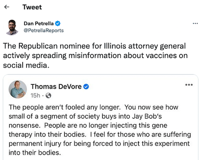 As Governor, my administration will oppose mandating COVID vaccines for grade school, college and employment. We all know the mandate candidate, J.B. Pritzker, will force it on your kids because he thinks the government knows better than parents. #twill