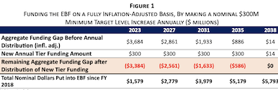 Figure 1 shows that if the state continues the practice of increasing year-to-year funding for the EBF at the Minimum Target Level, the legislation will not be fully funded in real, inflation adjusted terms, until FY 2038, which is 20 years after the EBF was first implemented—or double what is required in statute.