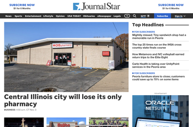 If you pay close attention to the SJ-R page at the top of this piece, you’ll note the majority of the stories are two to three days old. Local content in the print edition is virtually non-existant, save for high school sports. Maybe two actual local news stories in each day’s edition and the rest is USA Today re-printed and squeezed in between page after full page of advertising. They have no local presence that I know of and if you call their local phone number you get to talk to someone in a call center in Phoenix.