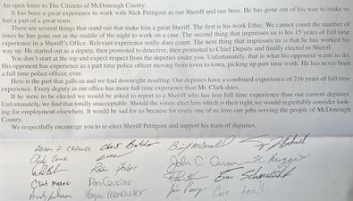 I first read it and thought the deputies would immediately quit if the other candidate won. However, after reading the full letter, they said they would “consider looking for other employment.” I would think the citizens of McDonough would want to know that turnover was likely to occur if the other candidate is elected. We have seen what that turnover does in the healthcare and restaurant industries. It would not be good in law enforcement. The current churn rate is hardly manageable.