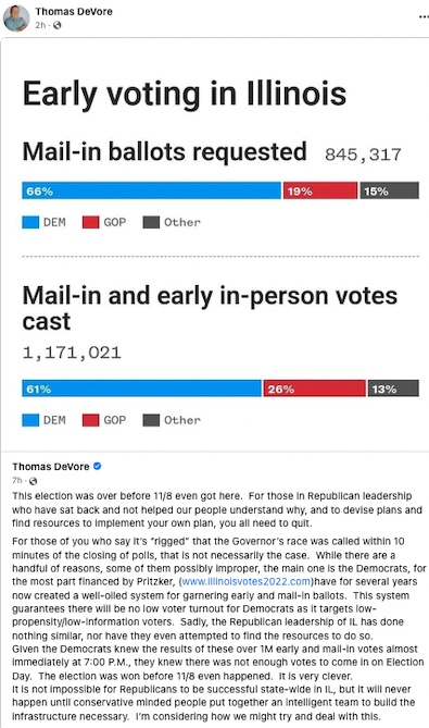 ==Devore FB Post”It is not impossible for Republicans to be successful state-wide in IL, but it will never happen until conservative minded people put together an intelligent team to build the infrastructure necessary. I’m considering how we might try and deal with this.==