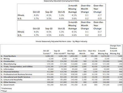 The Illinois Department of Employment Security (IDES) announced today that the unemployment rate increased +0.1 percentage point to 4.6 percent, while nonfarm payrolls increased by +3,600 in October, based on preliminary data provided by the U.S. Bureau of Labor Statistics (BLS) and released by IDES. The September monthly change in payrolls was revised from the preliminary report, from +14,500 to +14,100 jobs. The September unemployment rate was unchanged from the preliminary report, remaining at 4.5 percent. The October payroll jobs estimate and unemployment rate reflect activity for the week including the 12th.