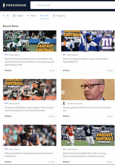 Yahoo Sports has an author who writes about fantasy football named Matt Harmon. It is just grabbing all his articles. So the normally accepted “quotes mean this exact phrase” functionality isn’t working.