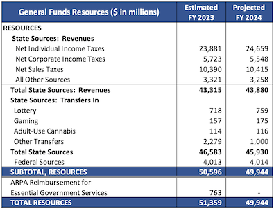 A 2023 recession would impact FY24 revenues✓ General Funds FY24 revenues are estimated to total $49.944 billion, a $1.4 billion, or 2.8%, decrease from revised FY23 estimates.