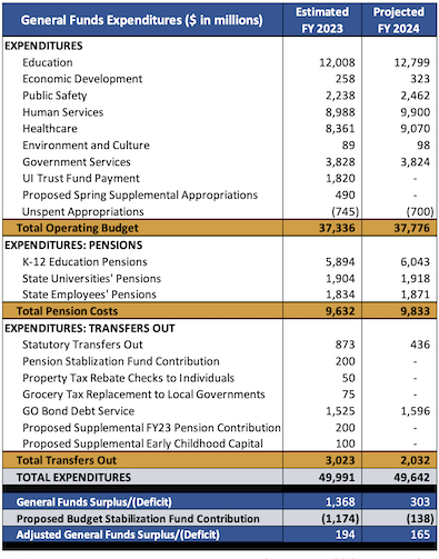✓ Reflects amount after proposed spring supplemental appropriations of $490 million and proposed set asides for pensions and early childhood capital✓ Estimated FY24 budgetary surplus of $303 million, with an estimated $138 million reserved in the Budget Stabilization Fund.